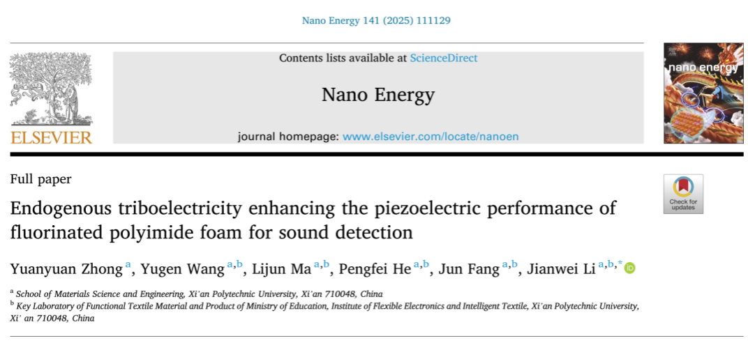 近年来,可穿戴压电器件取得了显著进展,但开发出具有高压电输出性能的可穿戴压电传感器仍面临诸多挑战。我院硕士研究生仲媛媛同学在《Nano energy》期刊发表名为“Endogenous triboelectricity enhancing the piezoelectric performance of fluorinated polyimide foam for sound detection”的论文,这项工作基于压电-内源性摩擦电耦合机制设计了一种含氟聚酰亚胺(FPI)泡沫材料,验证了在泡孔内构建内源性摩擦电结构单元提升材料的电荷输出性能。