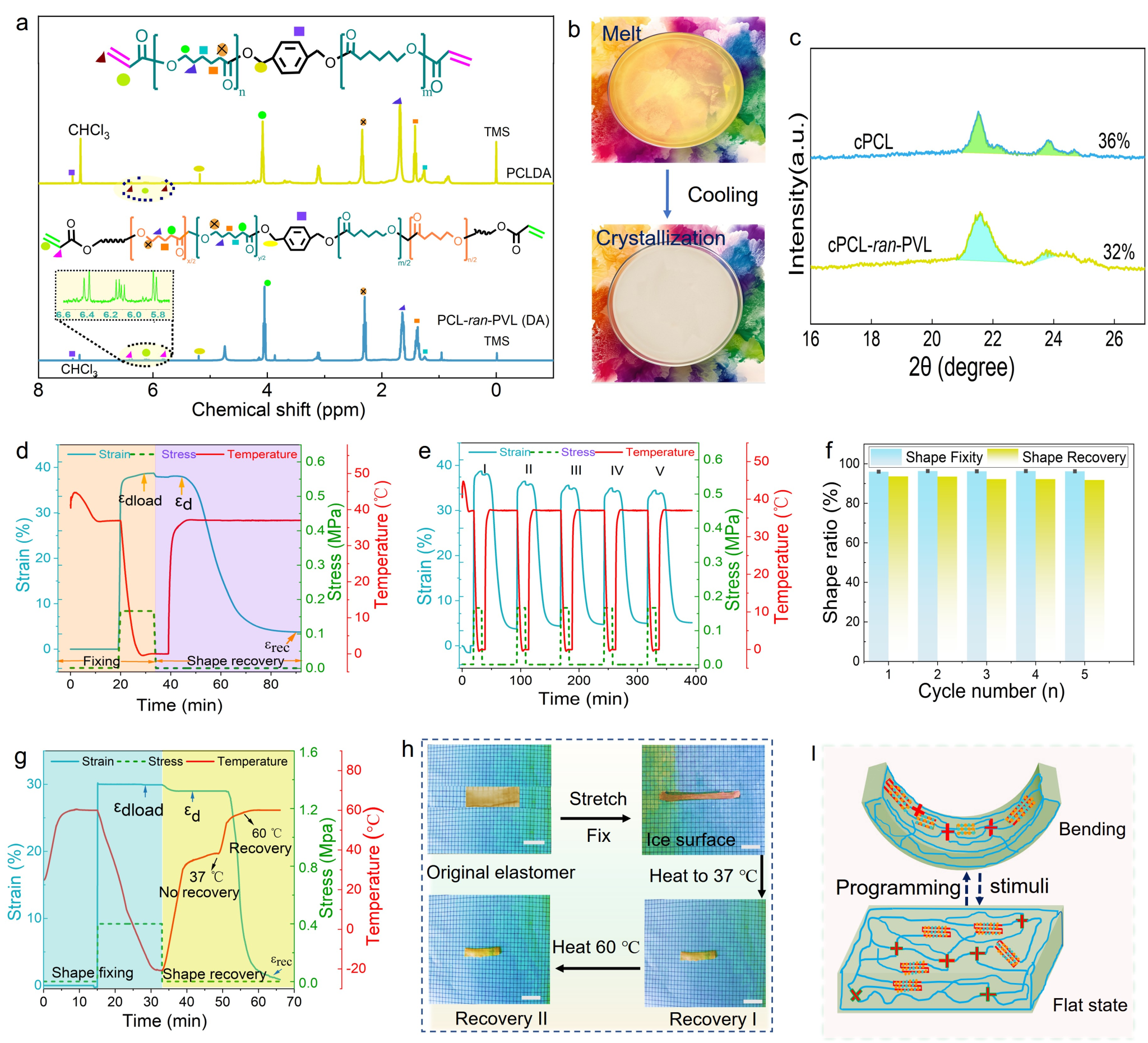 具备生物可降解与刺激响应特性的弹性体是一类新兴的智能材料,凭借其可调的变形性及生物仿生功能被应用于生物医学器件。然而,其固有的高驱动温度与简单的变形行为在很大程度上削弱了其优势。基于此,我们团队设计了一种结晶度和二元均聚物相当且兼体温响应性的动态无规共聚酯网络,其展现出可直接拉伸(冷拉)及应变诱导结晶,以此一步法对临时形状进行编程。