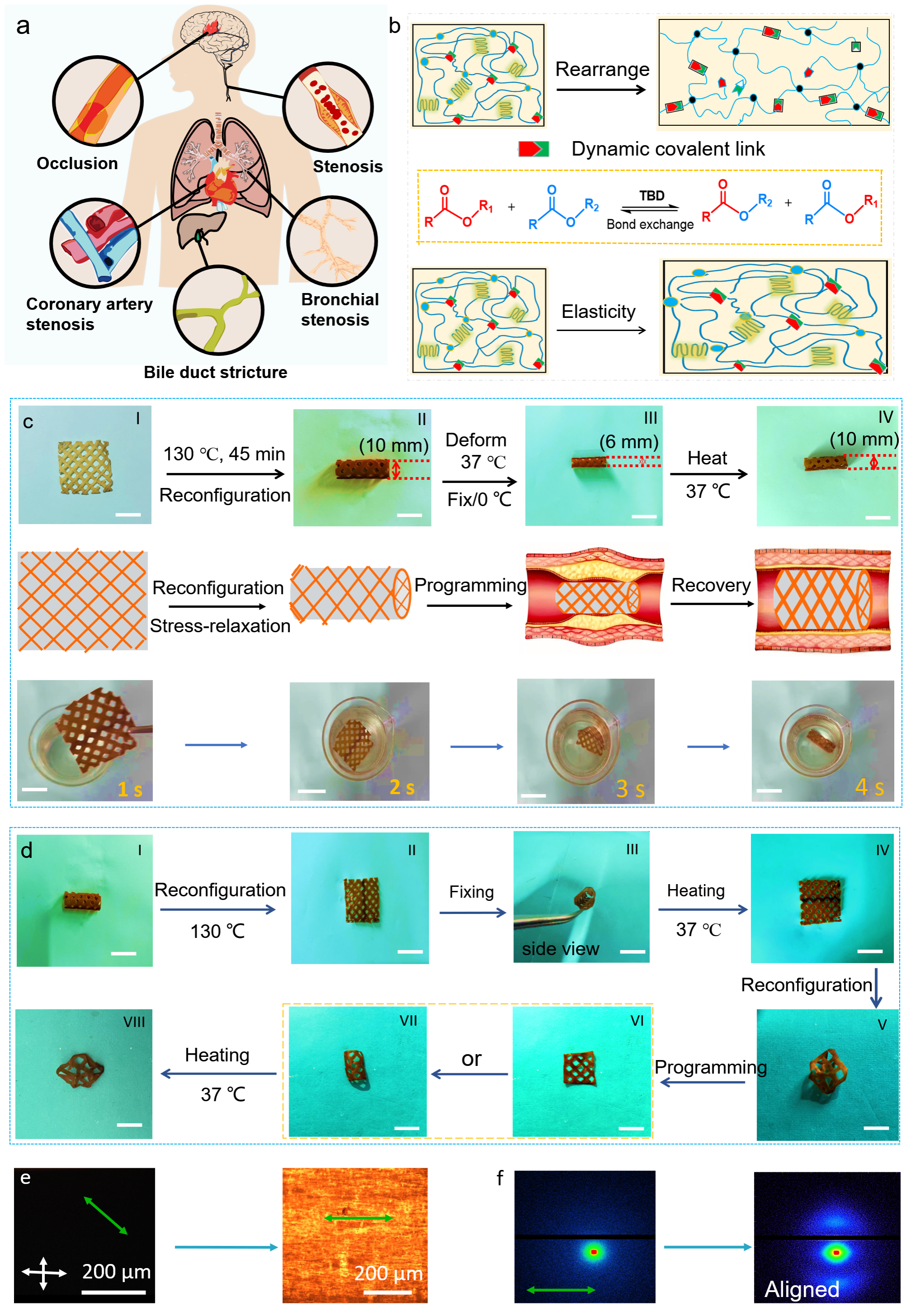 在伪共熔点与动态酯交换条件下,对丙烯酸酯封端的无规共聚酯进行二次光引发硫醇-烯点击反应后,所得结构在高温下进行应力松弛后可赋予网络固态塑性。紧接着在二维平面内植入内应力可实现形状的连续三维编程与弹性变形。体外细胞相容性进一步研究表明,该弹性体可作为重要的生物医用血管支架材料,为智能生物医学器件的构建提供了新的设计方案。