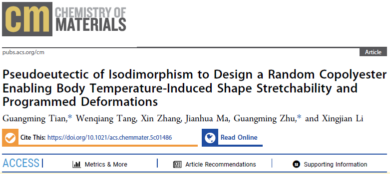 近日,我院马建华教授科研团队在材料化学权威期刊《Chemistry of Materials》上发表题为“Pseudo-Eutectic of Isodimorphism to Design a Random Copolyester Enabling Body-temperature Induced Shape Stretchability and Programmed Deformations”的研究论文。材料学院田光明为该论文的第一作者和通讯作者。此工作为智能弹性体驱动温度的可调性与3D复杂形状变形构建提供了简便合成设计思路。