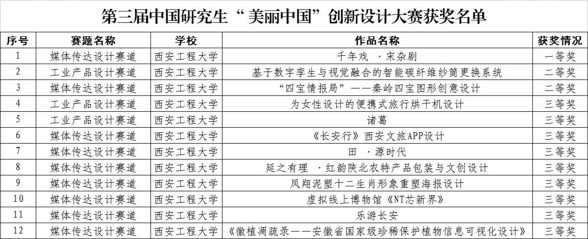 近日,第三届中国研究生“美丽中国”创新设计大赛全国总决赛在黑龙江大学举行,经过激烈角逐,我校研究生队伍获得一等奖1项、二等奖2项、三等奖9项,其中服装学院陈晨老师指导作品《千年戏·宋杂剧》获一等奖,服装学院李永轮老师指导作品《“四宝情报局”——秦岭四宝图形创意设计》、机电学院张周强老师指导作品《基于数字孪生与视觉融合的智能碳纤维纱筒更换系统》获二等奖,获奖数量和质量均创我校在该赛事全国总决赛中的最好成绩。