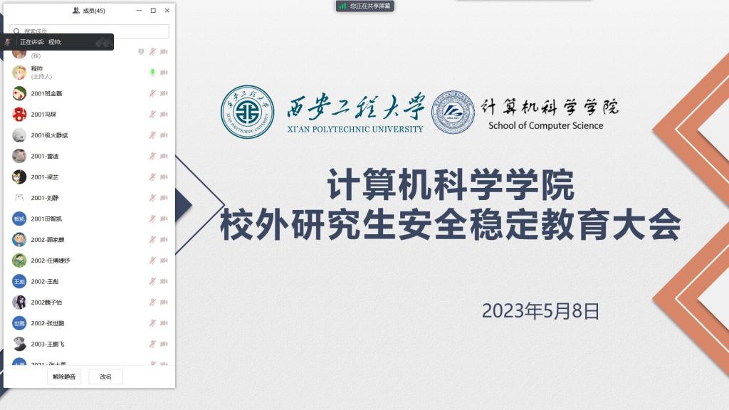 为进一步加强我院校外研究生教育管理,营造安全、健康、稳定的研究生培养秩序,5月8日下午,计算机科学学院召开了校外研究生安全教育大会。院党委副书记赵勇进、研究生辅导员程帅、兼职辅导员党子妍以及校外研究生(线上)参加此次会议。会议由程帅主持。