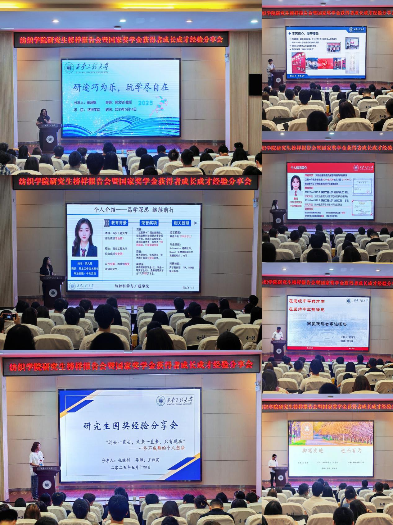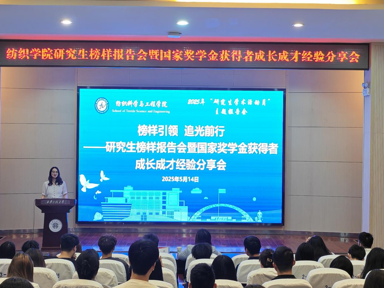 为充分发挥优秀研究生的榜样引领作用,激发全体研究生的学习热情与科研动力,2025年5月14日,纺织科学与工程学院在金花校区图书馆一层西纺报告厅成功举办2025年“研究生学术活动月”系列活动之“榜样引领 追光前行”研究生榜样报告会暨国家奖学金获得者成长成才经验分享会。学院党委副书记朱宇军、研究生辅导员姚婕、2024年研究生国家奖学金获得者和2023级、2024级研究生参加了本次活动,活动由姚婕主持。
