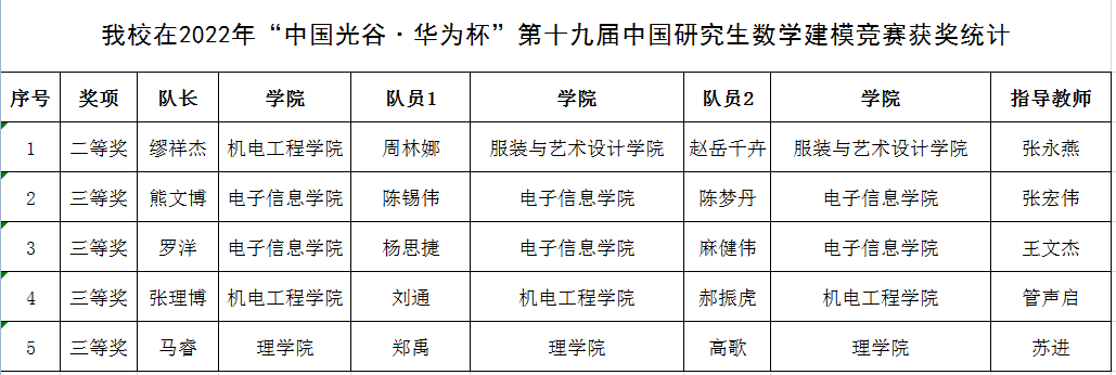 近日,2022年“中国光谷 华为杯”第十九届中国研究生数学建模竞赛结果公布。我校选送的29支队伍全部获奖,其中1支队伍获二等奖、4支队伍获三等奖,其余全部获成功参赛奖,获奖成绩与历史最好成绩持平。