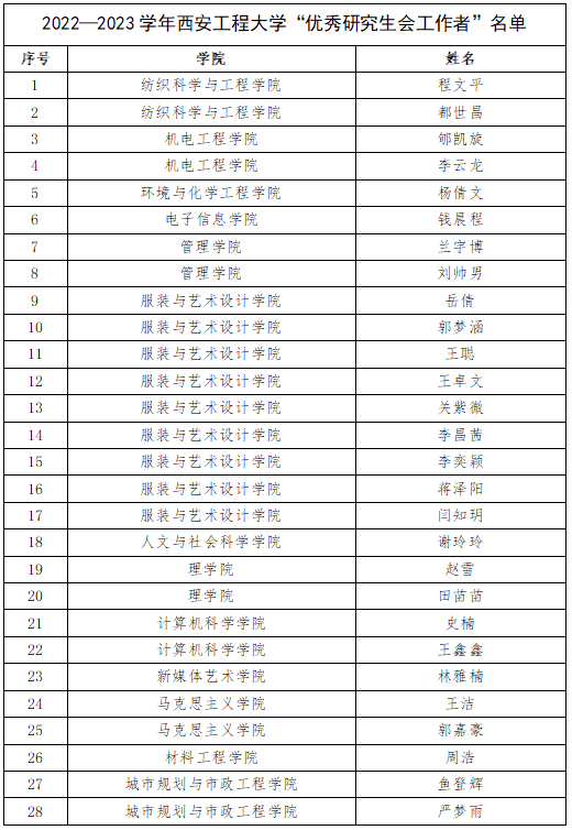 为切实增强研究生会政治性、先进性、群众性,着力提升研究生会工作人员的服务意识与奉献精神,根据《关于评选2022-2023学年西安工程大学“标兵研究生分会”、“优秀研究生会工作者”、“研会之星”的通知》,各学院遵循“公平公正、优中优选”的原则,按照“组织及个人提出申请,学院审核推荐、学校评审公示”的流程共推荐“标兵研究生分会”9个、“优秀研究生会工作者”29名、“研会之星”15名。2023年7月1日至7月12日,通过“笔试考核﹢公开答辩”的评审方式,就候选学生组织在思想引领、学生活动、权益服务、深化改革等方面工作,候选人工作内容、工作成果、成绩荣誉和总结体会等全方面展开考核提问。最终根据候选组织及候选人申报材料、笔试考核、公开答辩以及日常考勤等方面进行综合考评,拟评选计算机科学学院研究生会等5个研究生分会“标兵研究生分会”荣誉称号、刘佳祎等10人“研会之星”荣誉称号、纺织科学与工程学院程文平等28人“优秀研究生会工作者”荣誉称号,现将名单予以公示。