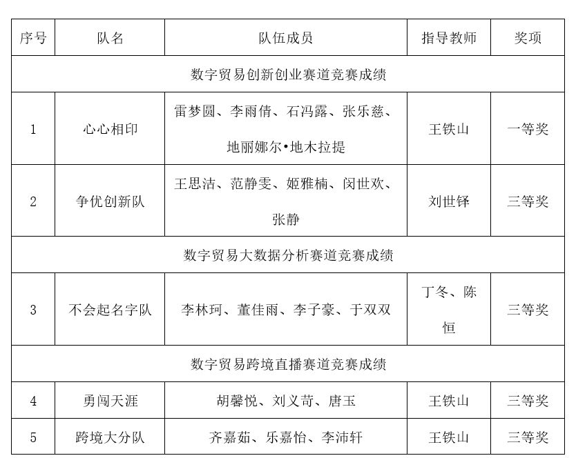 我校管理学院首次参加这项以数字贸易为主题的全国性学生竞赛,高度重视备赛工作。本届大赛组织委员会委员、管理学院院长助理王铁山副教授为参赛同学购买参考资料,并帮助参赛同学提升理论基础和实践技能。其中,2021级国际经济与贸易专业的雷梦圆、李雨倩、石冯露、张乐慈、地丽娜尔•地木拉提等同学组成的参赛队伍在数字贸易创新创业赛道竞赛中获得西北赛区一等奖并晋级全国总决赛,展现了我校学子扎实的理论功底和实操能力。
