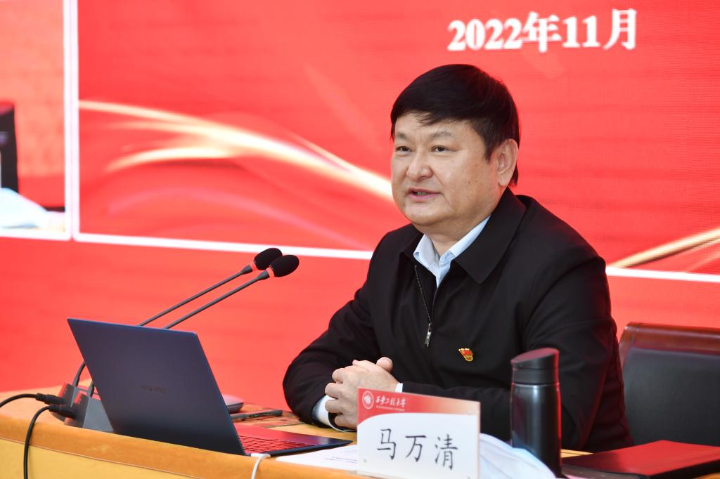 马万清指出,认真学习宣传贯彻党的二十大精神是当前和今后一个时期学校的首要政治任务,全体师生要全面深入学习领会党的二十大精神,要深刻认识党的二十大主题;深刻领会过去5年的工作和新时代10年的伟大变革,开辟马克思主义中国化时代化新境界,新时代新征程中国共产党的使命任务,中国式现代化的中国特色和本质要求,社会主义经济建设、政治建设、文化建设、社会建设、生态文明建设等方面的重大部署,教育科技人才、法治建设、国家安全等方面的重大部署,坚持党的全面领导和全面从严治党的重大部署,发扬斗争精神、增强斗争本领、坚持团结奋斗的时代要求。马万清要求,全校各级党组织和广大师生要迅速掀起学习宣传贯彻党的二十大精神的热潮,努力办好师生满意的教育。要凝聚强大精神力量,全面推动习近平新时代中国特色社会主义思想和党的二十大精神入脑入心;要坚定正确政治方向,坚持和加强党对学校工作的全面领导;要全面落实立德树人根本任务,努力培养担当民族复兴大任的时代新人;要坚持严的基调,坚定不移推进全面从严治党向纵深发展;扎根陕西服务大局,加快推动学校高质量内涵式发展。他号召全体师生不忘初心、牢记使命,做坚定者、奋进者、搏击者、弄潮儿,以永不懈怠的精神状态和一往无前的奋斗姿态,奋力谱写学校高质量发展新篇章,为全面建设社会主义现代化国家,为全面推进中华民族伟大复兴作出自己应有的贡献。