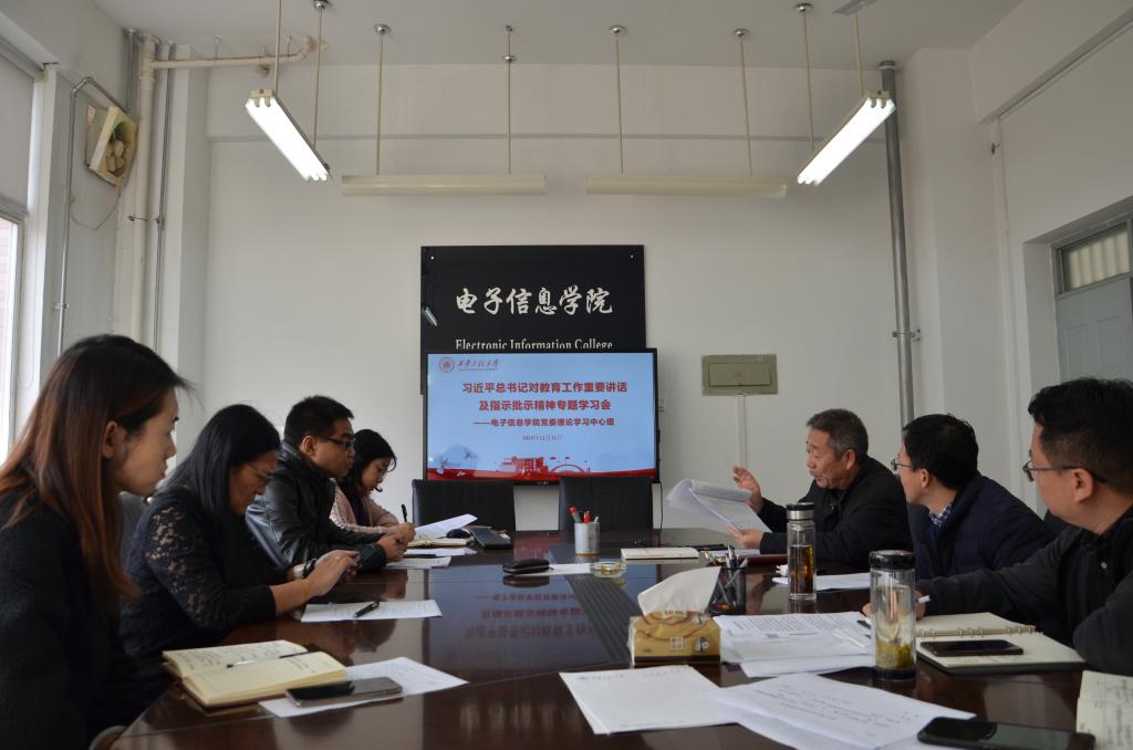 根据陕西省委教育工委下发的《关于对省属高校贯彻落实习近平总书记对教育工作重要讲话及指示批示精神情况开展监督检查的通知》《中共西安工程大学委员会关于进一步深入学习贯彻习近平总书记关于教育的重要论述的实施意见》的要求,2019年11月11日下午4点,电子信息学院党委理论中心组召开习近平总书记对教育工作重要讲话及指示批示精神专题学习会,会议由院党委书记杨恩科同志主持,党委理论中心组全体成员参加。