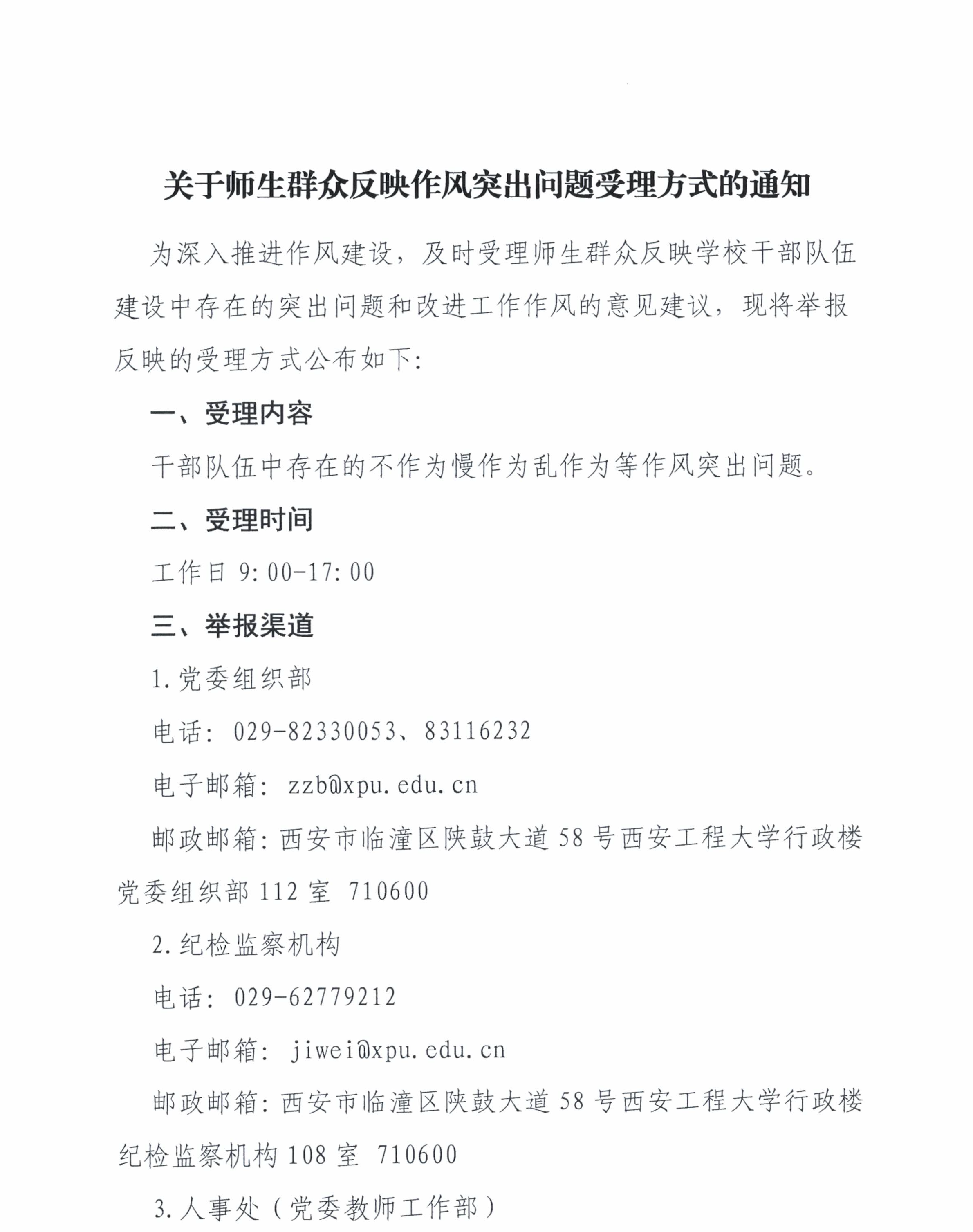 关于师生群众反映作风突出问题受理方式的通知