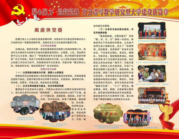 长期以来,离退休党委一直高度重视离退休教职工的服务管理工作,把老年文化建设作为校园文化建设的重要组成部分,从情感、人员、资金等方面予以大力支持,确立了“积极推动老年文化建设,努力构建和谐老年群体”的工作目标,形成了以思想政治建设为引领、以人员队伍建设为保障、以创新工作方式为抓手,积极推动老年文化建设。积极开展“展示阳关心态,体验美好生活,畅谈发展变化”的文体活动。