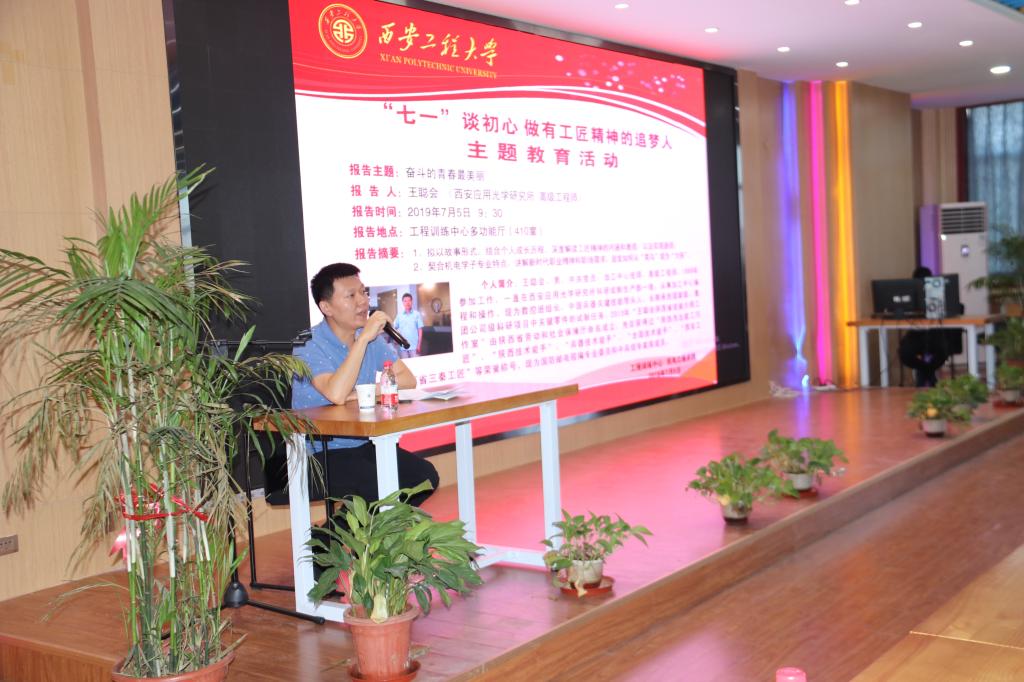 在中国共产党成立98周年之际,工程训练中心联合机电工程学院于7月5日上午在中心大楼多功能厅举办“ ‘七一’谈初心 做有工匠精神的追梦人”主题教育活动。活动邀请西安应用光学研究所王聪会高级工程师作专题报告。机电工程学院2017级全体本科生参加。