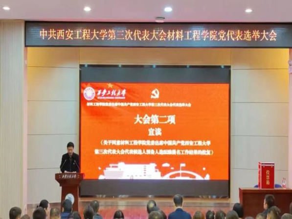 大会在庄严的国歌声中拉开帷幕。会上,学院院长贺辛亥同志宣读《关于同意材料工程学院党委出席中国共产党西安工程大学第三次代表大会代表候选人酝酿提名工作结果的批复》;学院党委书记赖斌宣读《材料工程学院党委出席中国共产党西安工程大学第三次代表大会代表选举办法》、副书记刘畅宣读监票人、计票人名单,并经与会正式党员举手表决,一致通过。